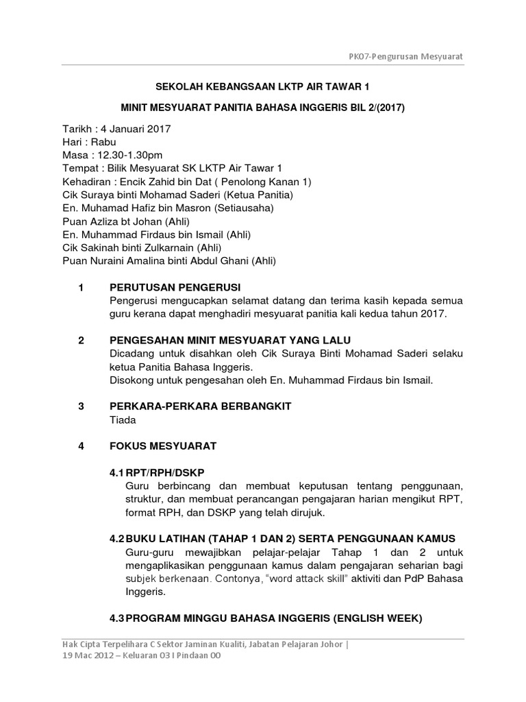 Minit Mesyuarat Panitia Bahasa Inggeris Pdf